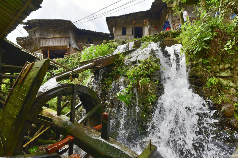 鱗次櫛比的老房子層層疊疊架在山坡上,一串串喜慶的紅燈籠密密地掛在屋簷下,襯得老房子越發古舊可愛,這裡所有房屋建築基本上是穿井式木石架構,有些房屋因地基窄,柱子直接架構在下一層山坡上形成吊腳樓,頗有山地特色。
